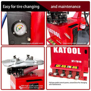 The Katool KT-T810 Wheel Clamp Tire Changer Machine is designed for durability and efficiency. The alloy steel jaw undergoes precise carburization treatment, ensuring both interior tenacity and exterior hardness. With a stainless steel mounting head, inflation gauge with pedal control, and high-quality spade cover, this machine prioritizes user convenience and rim protection. The pull-type pedal control system streamlines tire changing, complemented by a top-level motor for efficient performance. Tailored for North America, it operates with a robust 120V/1ph/2.0HP motor, providing enhanced power and efficiency. The closed body design ensures optimal protection for internal components, making the Katool KT-T810 an ideal choice for tire-changing needs.